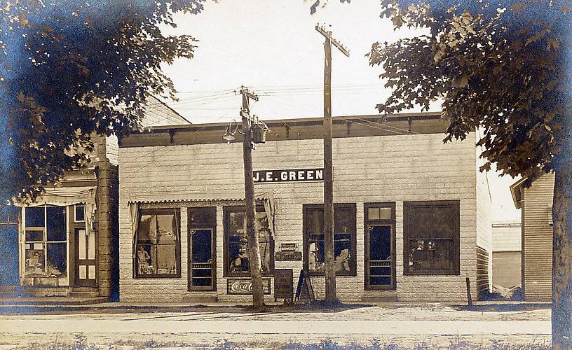 A telephone openwire line stands above the electric lighting service pole beneath. Note the old cast iron transformer and incandescent street light. The latter was wired in electrical series (common practice years ago) and a break-arm positioned upon the end of the pole's top arm terminated the street lighting wires on each side with connections to the fixture beneath. Also note the real sturdy block building construction, Coca Cola sign, etc ;-) |