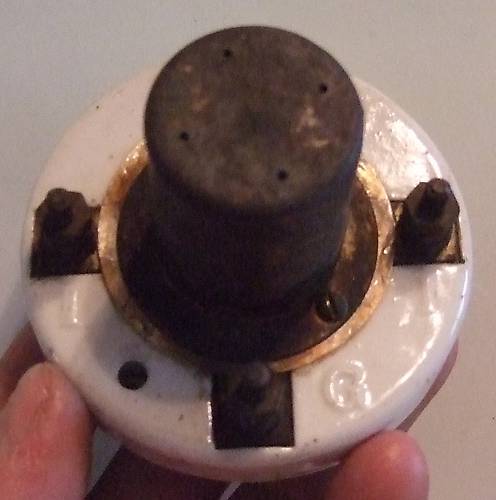 The porc base has a 3 5/8ths diameter. The cap is tarnished brass with pat date of 1905.