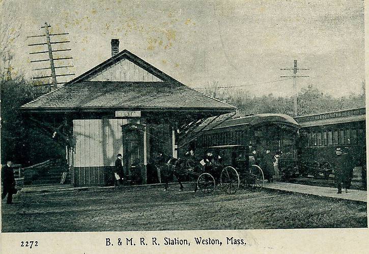 This was (and is) a major East-West RR route between Boston and Albany, NY...and westwards. On the left likely are long distance AT&T phone circuits (with 10-pin arms) with a six-pin crosarmed pole having a wooden telegraph connection box (on the far right) connecting to the station's telegrapher. The AT&T line did not follow too much of the B&M right-of-way. Weston, MA is about ten miles west of Boston. The latter telegraph line was totally rebuilt at some time during the early teens, replacing decaying poles and the iron wire with hard-drawn copper. This line utilized double-petticoat telegraph insulators (typically CD 145 Brookfield's and CD 152 Hemingrays as upgrades) mounted on new ten-pin crossarms. This line remained fairly intact ableit with lots of newer poles until it was dismantled around 1990. |