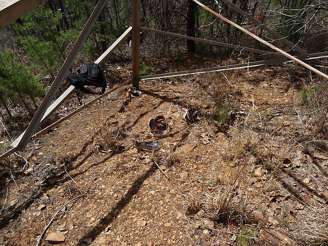 Talk about a load of work, we found 24+ metal caps and hooks from the tower down the slope. Not to mention a load of porcelain shards scattered downhill. We hooked 8 or 9 broken insulators up on the metal bar and had a massive jigsaw puzzle going. We found that some of the insulators are 3/4 there but missing shards still under the leaves. Calls for a trip back soon. |