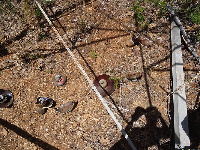 Above all we had a great hunt. Unfortunately, six additional towers hunted to yielded metal with little to no porcelain and scattered shards. The thorns and pine trees were vicious too. What was really neat to end the day was that the line actually passed a hundred feet from a large waterfall and great creek. The pond below the falls was great to cool off from the hike we made! Just a thought was surely the line crew spent some time at the same falls 101 years ago. |