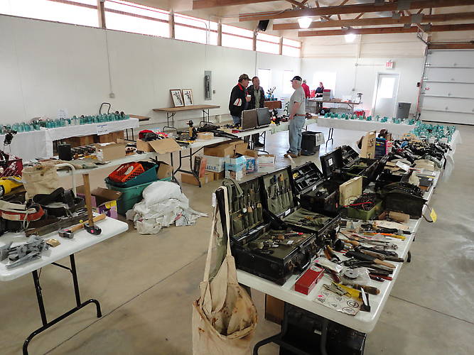 2014 Yorkville, Illinois Insulator Show, Tom Nugent's Tables of Telephone tools & equipment, WOW! Tom was lucky to have so many grandchildren too. I counted at least 6-8 grandchildren helping him pack all this stuff up. I'm sure they helped him setup too.. Come-on Tom hire some of these kids for us too, LOL.. |