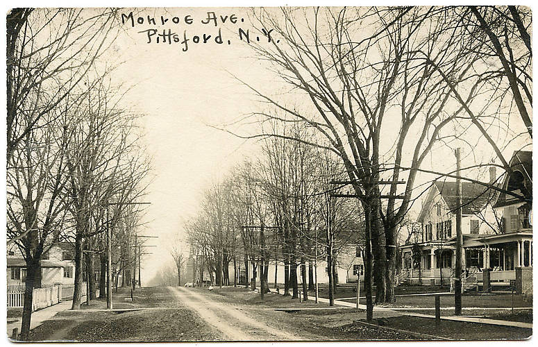 Alley arm construction was the rule along the left with standard 10-pin crossarms along the right of this tree-lined New York State residential street. Like the next photo (click "Previous") perhaps one line was in the process of being upgraded by the other...or perhaps two different phone companies provided service here? |