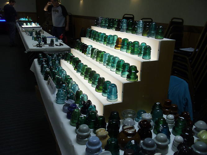 Some very nice glass for show and sale on Rick Hess' table. Sorry about the darkness, the light auto-correct was on and my camera took issue with the under/back lighting. The 14th Annual Allegheny Valley Insulator Show at the VFW Hall in Natrona Heights, PA on Saturday, April 5, 2014. |