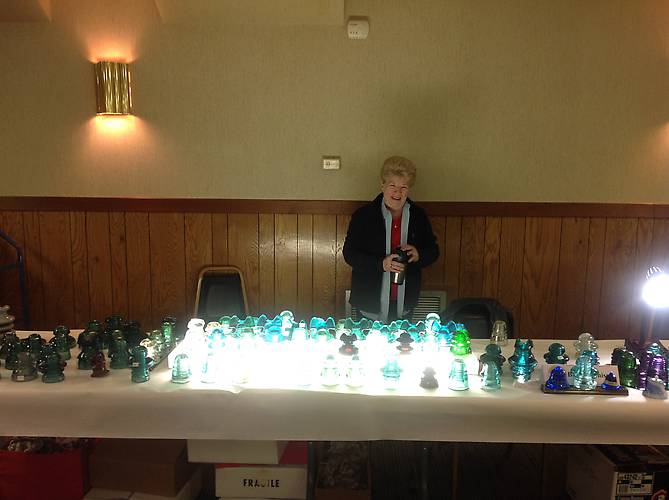 Joyce Hutchison minding the store while Bill off looking at something. The 14th Annual Allegheny Valley Insulator Show at the VFW Hall in Natrona Heights, PA on Saturday, April 5, 2014.