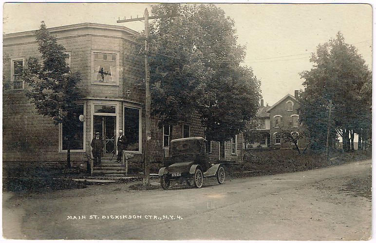 Utility wires crossed over at this intersection above this fine vintage automobile. The lower arms were much shorter as you can see and might have been for electric lighting service. Also note the very nice reflection of the poletop with its top crossarm in the window facing you on the second floor ;-) Another pole *rather* irregularly constructed with openwire and crossarms is seen extending into this tree lined roadway. |