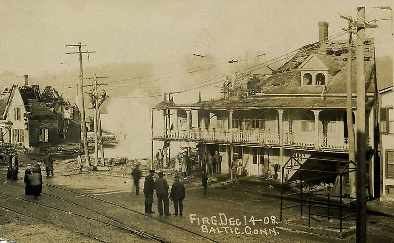 A bad fire in this Connecticut town ruined a lot of telephone and electric lighting circuits in this business district. On the left are a couple lineworkers on a pole performing restoration efforts.