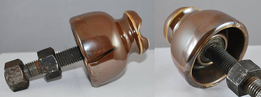 Metallic tan U-559 cemented on a large bolt with lead or other metal alloy. One of 4 found in 1994 on a line in Oregon. Two of the four were cemented on bolts. It was made circa 1905 by Imperial or Thomas. Was $50 reduced to $40 plus shipping.