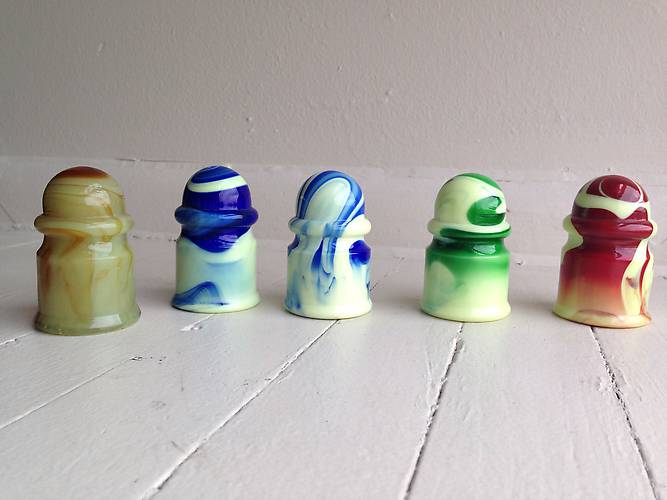 Not my usual find of insulators, but a great find nonetheless! Great color spread from cream/caramel/brown, two cream/cobalts with varying degrees of blue, cream/green and a cream/red. Thanks for checking out my picture :)