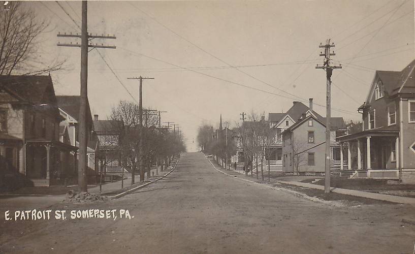 Telephone openwire circuits likely for local subscribers also extended along the left. An early cast iron electric step-down transformer is seen on the pole on the right. When this photo was taken, stepping down either 2,200 or 1,100 volts primary to 110 volts for customers was common practice in residential neighborhoods like this across the US. |