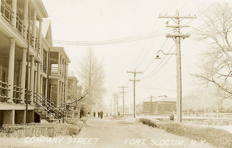 A radial wave incandescent street light also graces this photograph as seen on the right. Note the "break-arm" bracket on the middle crossarm which terminated a line wire on each side. From there a wire extended down each side of the line-break to the street light which was wired in electrical series. This one-wire method of street lighting was popular for over 100 years and is still used in some southern California communities, albeit with modern light sources. |