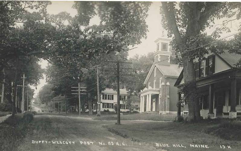 The latter extended along the right side of this Maine community's main route through town. Also note the electric line on the left with two (glass?) insulators on a short crossarm along with one on a pole-top ridge pin. The latter likely were for higher primary circuit voltages. |