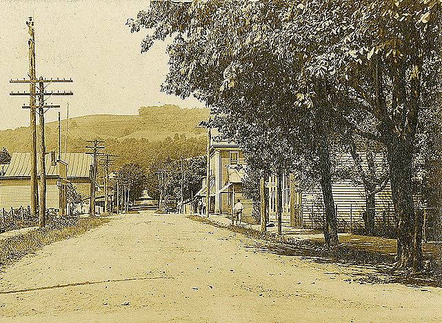 A telephone subscriber lead extends along the left with another (taller) pole nearby it. I am unable to determine what kind of insulators or related stuff fashion the top of it. However these could be porcelain insulators for electric service in an arrangement that were in an odd position for the photographer, keeping us insulator enthusiasts a century later scratching our heads :-) |