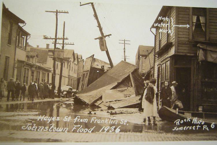 This Biblical storm affected most of the Northeast with incredible amounts of rain and some wind. Older dams (not anywhere prepared for anything like this) broke, thus flooding many cities and towns...right up to Maine. The historic and very powerful Hurricane of 1938 that roared up through New England two years later added much widespread insult to injury to pretty much the same regions. Added note: Note the "High Water Mark" inscription along with an arrow to the right....yikes!! |