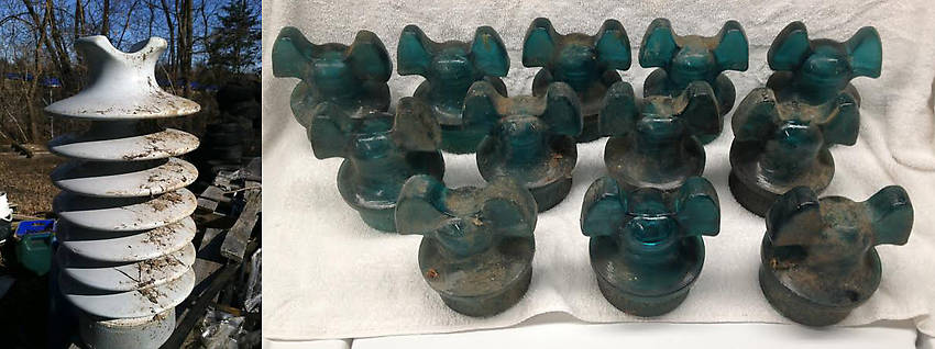 On the left side of the image is a picture from a Craigslist ad for new 24" ceramic post insulators for $5 each in Jackson, Michigan. Coming home from Columbia City was the perfect opportunity to stop by the seller's house and buy a few. We asked him if he had any other insulators and he said all he had were some weird ones in a bucket in his shed. Turned out to be a 5 gallon bucket with all CD 257 Hemingrays. They were rescued from an old industrial building in downtown Jackson, Michigan. I bought an even dozen, all in excellent condition, and appearing to be mostly Hemi blue. I also bought 4 of the post insulators and they are still new in the original crate (he has a pallet of them). The perfect end to a fun day that began with a stop in Columbia City for a cool show, hitting several antique stores in southwest Michigan, then unexpectedly finding some cool glass when almost home! |