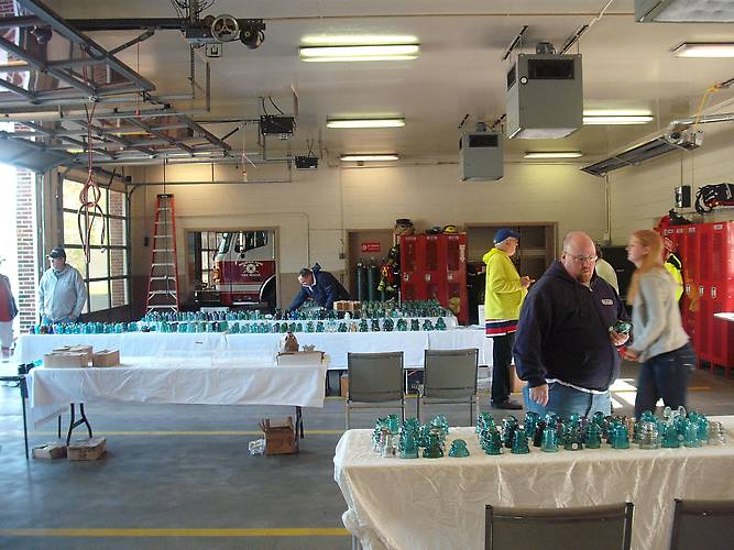 Yes, this is in a fire department! This year's swap started off a little slowly, but it sure got going later on. Dudley Ellis stands by the doors. Ken Roberts is trying to fill his four sales tables. Dave Kingston chatting with someone. Mike Herron shops for glass. A great day to be out at a swap. support your local swaps. |