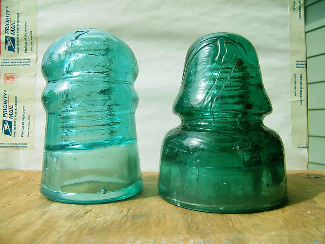The CD 162.5 B (P.R.R.) on the right is a crude insulator with deep straw lines on one side of dome. It also lots of fizz, a glob of yuck in the dome and numberous bubbles throughout the insulator. The 126 Fulton St. creb is pretty plane. Has a #7 shop number on front side. I count it as a freebie being I was given a special rate being a return customer. |