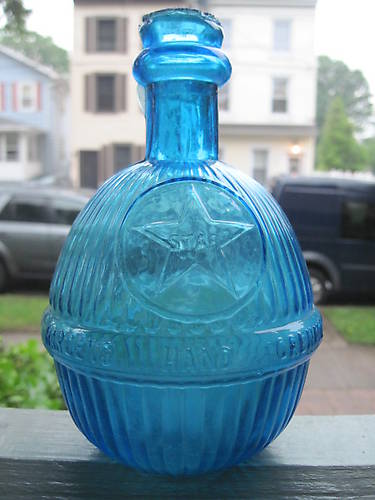 FRONT READS: STAR IN A 5 POINT STAR, HARDENS HAND GRENADE. REAR READS: FIRE EXTINGUISHER. IN LIGHT SAPPHIRE BLUE, MINT CONDITION, SOME TYPICAL ROUGHNESS AROUND NECK-HOLE, SOME SLIGHT STAINING ON THE INSIDE, WHICH IS COMMON WITH THESE, COULD POSSIBLY BE CLEANED OUT. FROM AROUND THE 1890'S $125 SHIPPED EAST, $130 SHIPPED WEST. CANADA EXTRA. I WON A FEW FIRE GRENADES IN A GLASS AUCTION A DAY OR SO AGO, SO I THOUGHT I COULD LET ONE OF MINE FIND A NEW HOME TO MAKE ROOM FOR THE NEW ONES. COMING FROM N.J. |