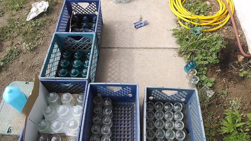 From top, to bottom right: CD 154 Hemi HBlue [020] SDP 'fangs' CD 154 Hemi Aqua [070] RDP CD 155 Hemi Clear & Lemon [various] Various base types CD 128 Pyrex Clear [various] SB CD 129 Hemi & WT & ARM [various] in Clear & Smoke A few personal culls from the haul, near the crates. |