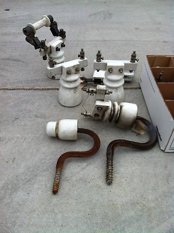 Of course I don't give out all of my referrals. These photos are from a collection from an Orange County electrical contractor who had a diverse grouping of glass and porcelain insulators: telegraph, telephone, power, foreign and domestic. These are general photos. More detailed photos will follow. Some of these I have never seen before. Check out these porcelain spooks with extra hardware. |