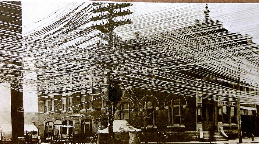 This picture was incorporated into a piece of South Western Bell propaganda from the late 1970s. Something about "Maybe if you arent happy with our new rate increases you'd like to see things get like this again." Or something. US Express office across the street and probably a telephone office on the left corner. |