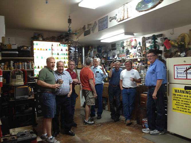 Dan Gauron opened up his house the night before for a collector's gathering. A good spread of food and lots of insulators from Dan's collection to some show and tell items. Here is a shot of some of us who attended. Forgive me for not labeling the people as I don't know everyone. |