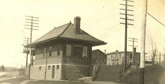 It is very possible when this photo was taken that the older 6-pin telegraph pole line seen here (on the right)(Western Union?) was in the process of being upgraded by the 10-pin line viewed (on left). The older (6-pin) lines (c.1890) mostly had iron wire. The newer pole lines WU and others were upgrading to around 1910 into the teens employed 10-pin arms, double-petticoat insulators, cedar poles and hard-drawn copper wire (as seen on the left). This was the rule mostly throughout Western Union country as standard procedure at least here in New England. Some of these poles and lines stood sturdy through the 1980s when (sigh!) removed from most RR rights-of-way in this region. |