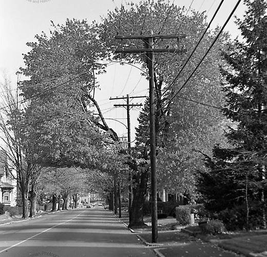 Gotta love the "Donut Tree" as I fondly recall ;-) This was along Forest Avenue, about a half-mile east of the century-plus-old Brockton Fairgrounds. This is among my memory lane stuff that got me into gawking at and later collecting utility stuff (starting with insulators) having been born and brought up in Brockton, MA. Wooden pins were the rule with the Brockton Edison Company until around 1960 when they started to use lead-headed steel pins. Here we see a nice old line built around the 1930s with nothing but black transformers, brown insulators and similarly colored lightning arrestors and (LM) box cutouts. I grew up in Brockton and recall scenes like this very fondly. In the early 80s most of the poles were replaced owing to boring 13.8 kv primary conversions and replacement of the late 1950s mercury vapor street lights (shown are 175W Westinghouse OV-10 models) with high pressure sodium fixtures. Their pintypes and multiparts almost exclusively were Lockes from the teens and for some reason I have ever loved these simple porcelain insulators ever since, I wonder why? |