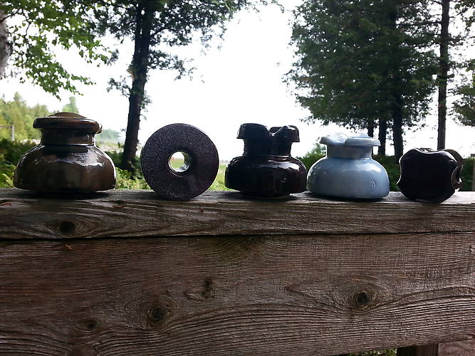 Porcelain insulators found in an antique shop in Owen Sound, Ontario. Left unmarked, LM incused marking on spool, 3rd marked CP, I think, blue is Ohio Brass, Johnny ball is etched CP, I think, with numbers etched outside the letters.