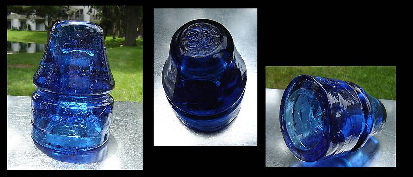 Here's a square pin threadless insulator in a great shade of Sapphire blue. There are only two of these left in this color, and it is numbered on the top 13. The color, style, shape, and bubbles in the glass make this one a classic design that will continually increase in value as time goes on. It's not cobalt blue. It is a great shade of Safire blue with bubbles all throughout the glass Price? $65 postpaid anywhere in the USA. First e-mail at Guardfrogdesigns@GMX.com gets it. PayPal is fine so long as you send payment as a personal payments, so we both won't have to incur the fees Thanks for looking - good collecting. |