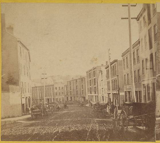 Pintype insulators are not visible upon these crossarms. I suspect some type of ramshorn hook insulators were employed on the underside of these arms since some stretches of these insulators were used in the 1860s along the main RR line along the coast from points north to New York City, especially in southeastern CT. Added note: John R. from CT made the suggestion that perhaps this was a new replacement pole not yet outfitted with pintype insulators. That could be since we see a pole with sidepins down behind it. |