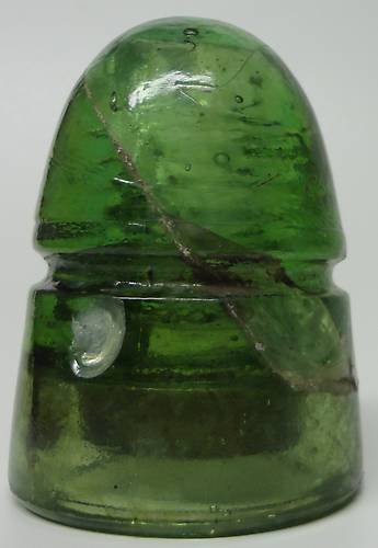 Tired of feeding the mosquitoes and swinging ineffectively at the deerflies, I bolt from the dusty dump in the dank woods. 4 hours solidly going at it with nothing to show and it was time for a break. I hike over to the abandoned railroad line, crash through the brush and emerged on the side where the poles are long gone. The farmer isn't plowing even close to the fence line so there is little hope of finding anything. At this point in the afternoon I prefer to not find anything out in the sunshine and fresh air of a beautiful day rather than back in the awful dump. Soon in the hike there is a chunk of glass showing in the field. When an insulator is shattered off a pole the pieces tend to fly into the field so that is not remarkable. As the piece is pulled from the dirt it becomes a whole insulator. A CD 145. The "Postal" style. The kind marked BROOKFIELD". And in green. I like these. The dirt hasn't begun to be wiped off but I'm trying to figure what part of the collection it will fit in. Then I notice the embossing. On the base. Its a green American 145. I like these even better. It is full of cracks but whole. It will be easy to be in a good mood on the drive home. |