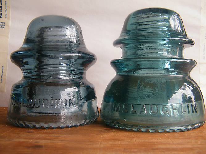 Left Dark Delft blue. EIN 070 SDP's. Five of which are hollowed or not fully formed (underpoured). Has total of four flea bites that may also be surface bubbles that bursted. Books 50-75. $50 shipped within USA. Add $7.50 if Canadian addres eBay $25 shipped. Right : Dark Steel Blue. Much nicer then pic color. EIN 050. Short mold. Mint condition. First email will have this insulator shipped for $30. Add $10 if you have Canadian address. $30 shipped. I accept Pay Pal non-fee, personal and money order checks as payment. Will combine shipping and give give discount on every insulator purchased after the first. Why not save some buck? See what other insulators I have for sale here at Icon. Be sure to email me about either of these two before adding to your cart. It might get away while your looking at other glass. |