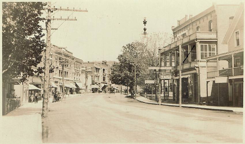 Extended "alley-arm" crossarms supported telephone openwire wires along the left in this photo for safe clearance from adjacent tree foliage and buildings (as seen in the background). A very nice looking arc light illuminated this community's business district. It was mounted on a span wire that crossed this road with electric lighting lines also seen along the right side of this image. |