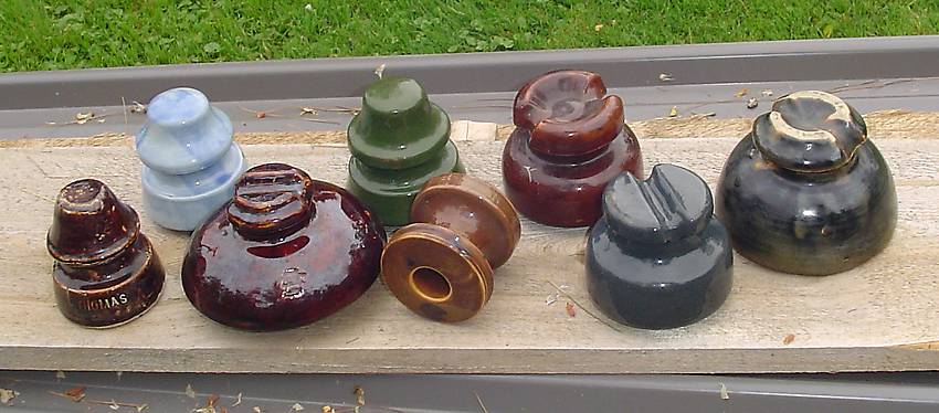 We stopped in at a junky 'antique' store a few days ago that had several boxes of insulators, all of which were undamaged and no two the same. I asked for a price for all of them but he wouldn't sell. His price for individual ones was not to my liking so we departed empty handed. This morning I had to make a trip to the scrap yard for a friend - her boyfriend had moved out and since I have a truck and spare time, I became her new best friend. ( everybody with a truck knows what I'm saying). While I was at the scrap yard I bought a couple pieces of interesting scrap iron for a few dollars. I have just returned from the junk store where I traded the scrap iron things for these 8 insulators. While no big deal was transacted we both came out ahead. U numbers are not my thing so there is a Thomas signal, a very nicely marked two tone blue signal. An infinity marked Locke, an unmarked green CP signal beside an odd coloured U-2421 cable top. A CP spool in another odd colour, A dark grey, almost black, new and unused cable top, and a nicely mottled triple skirted power piece. |