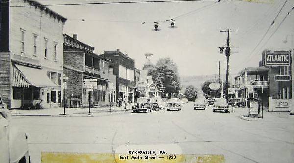 Spanwire street lights were rather common for illuminating intersections from the early arc light days of the 1880s through the 1960s in the US and Canada. Seeing a double arrangement of such street lighting fixtures is quite rare and unusual since I am a collector of old street lights and related items. The fact that these are of then-popular incandescent, ruffled-shade, "radial wave" design certainly makes this image a very nice example of 1950s Americana ;-) |