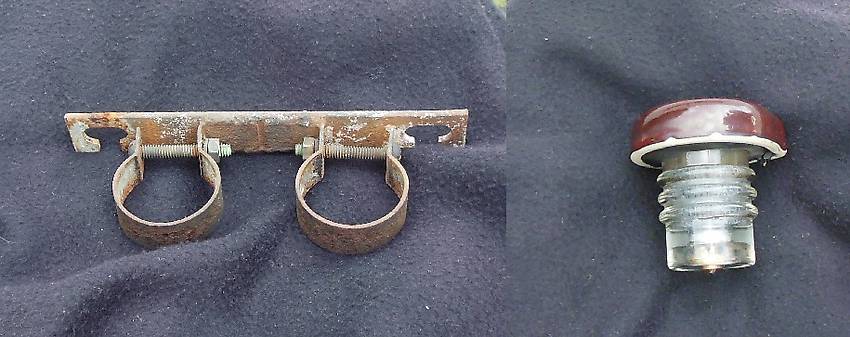 I have a twin lightning arrestor bracket needing a yard pole to be used on. Holds the glass cylinder with porcelain cap type arrestor as shown. Only the bracket with screws and nuts is what you're getting. Could use a wire wheel cleaning and a coat of polyurethane. $5 + shipping. |