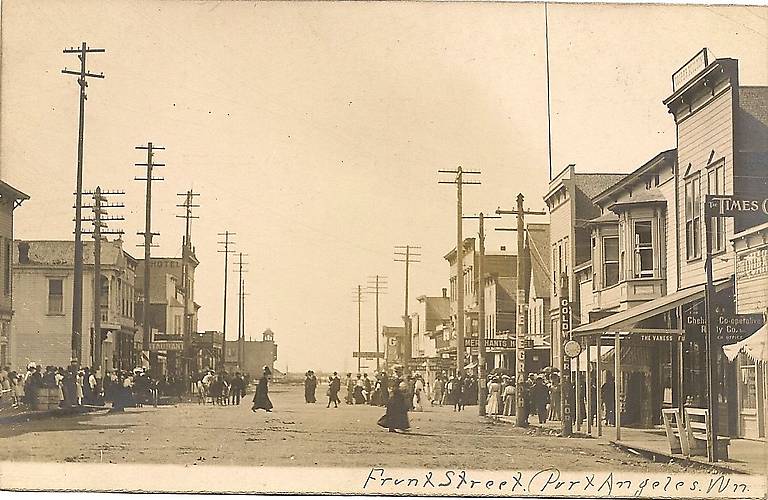Electric lighting, telephone and telegraph comm open wire lines are seen here in this Washington State community. The tall pole line along the left certainly looks older and more primitive than the others and quite interesting, too ;-) Added note...Thanks to Brent B. from Spokstanian, note the vertical lettering "Telegraph" painted in big letters on the pole on the right. Brent adds that judging by its construction it probably was owned by the Postal Telegraph Company. From the classic "rooftop-peaked" wooden junction box on top of it, paired cable led to the telegrapher's office. |