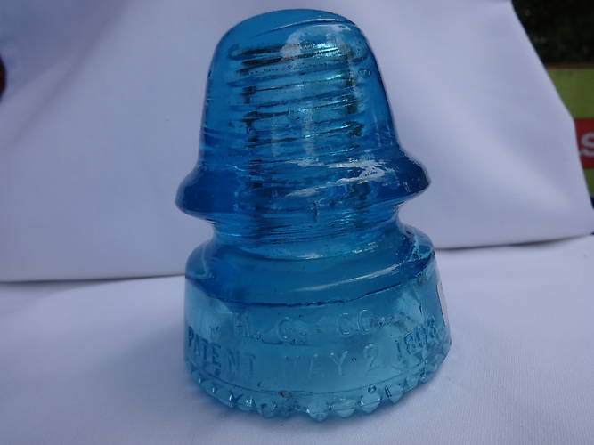 Rear Petticoat. SDP, Color Electric Blue with milk, bubbles scattered throughout insulator, 9 damaged drips, peck on side of dome, Picture taken outside. New Reduced Price! Priced at $250.00 plus shipping costs