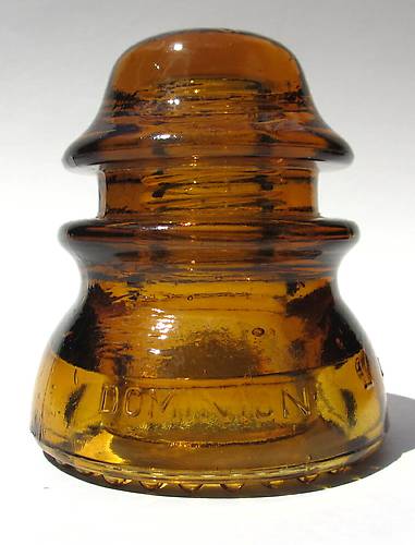 Nice looking CD 154 Dominion 42 insulator in a real glowing orange amber colour. The dome is darker than skirt area. Only flaw is a slice off the inside edge of one drip point.