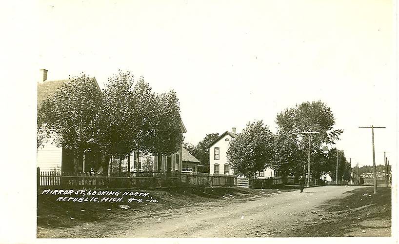 Possibly competing companies existed in this Michigan community or a pole line upgrade was in progress when this photo was taken? It is quite interesting to note that this was taken along "Mirror Street" with nearly identical pole lines along each side of this unpaved roadway...hmmm! |