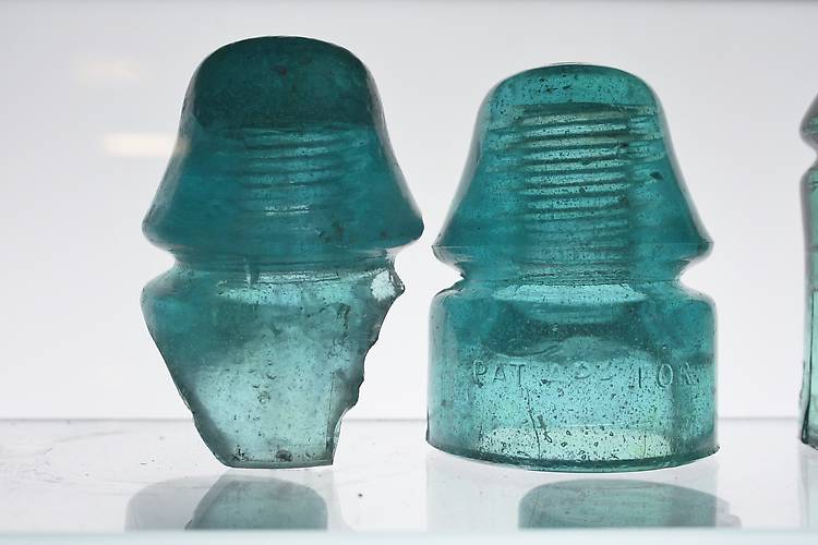 Sometime when hunting or researching a telegraph line whole insulators and examples are nearly impossible to find. Not finding insulators on a line that once held thousands and thousands occurs for various reasons. I live among such lines. I have found a fun and challenging way to document and get examples of the insulators used on that line. I go on my hunts and look for whatever I can find. If I find a chip of glass I try to identify it . If it is not an example already in my collection OR if it is a better example, I bring it home. Once home the next fun challenge is to locate a whole insulator that matches it to color and embossing. Once I do that I have a set as you see here. This way I can have an actual insulator from the line even though it is damaged and then show what it looks like relatively undamaged. It is my hope that in the future I can share more of the story of the line I have chosen to enjoy.