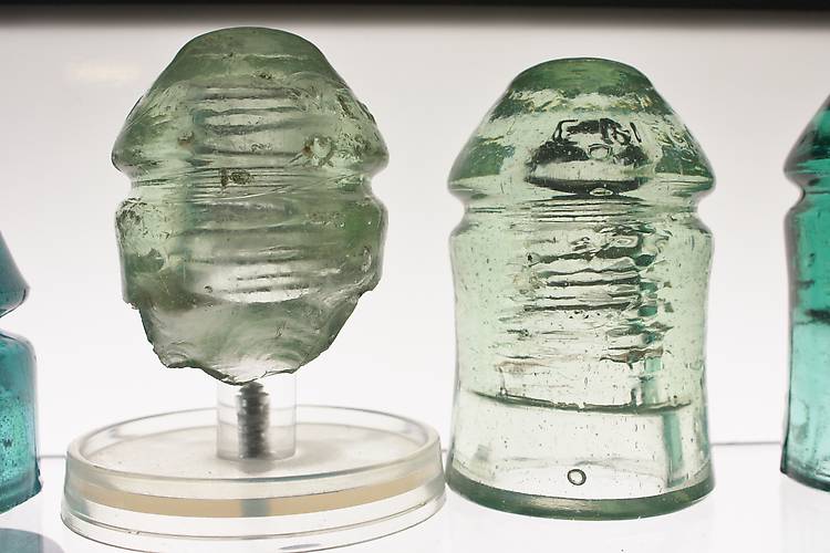 Sometime when hunting or researching a telegraph line whole insulators and examples are nearly impossible to find. Not finding insulators on a line that once held thousands and thousands occurs for various reasons. I live among such lines. I have found a fun and challenging way to document and get examples of the insulators used on that line. I go on my hunts and look for whatever I can find. If I find a chip of glass I try to identify it . If it is not an example already in my collection OR if it is a better example, I bring it home. Once home the next fun challenge is to locate a whole insulator that matches it to color and embossing. Once I do that I have a set as you see here. This way I can have an actual insulator from the line even though it is damaged and then show what it looks like relatively undamaged. It is my hope that in the future I can share more of the story of the line I have chosen to enjoy. |
