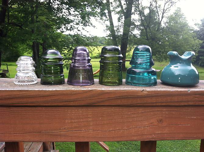 Went to a garage sale this morning because they listed stuff i look for other than insulators. Walked in an found these 6 insulators on a table. A CD 100 surge, CD 113 star in green, light purple AGEE, CD 121 U.S.TEL in green, CD 162.5 PRR in aqua. A nice green porcelain piece. |