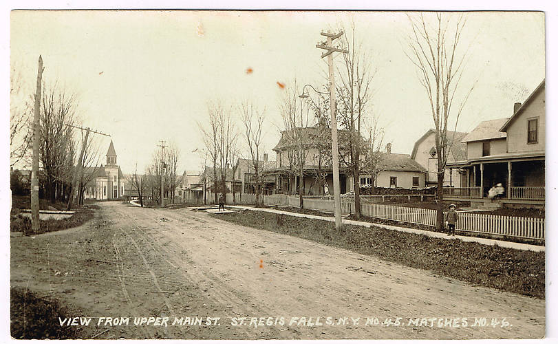 An old crooked telephone subscriber lead is seen along the left with an electric lighting service pole on the right. The latter had crossover crossarm construction and an incandescent street light beneath on a "gooseneck" pipe bracket that once illuminated this pleasant New York State community's intersection. |