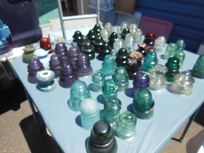 Pictured are about 20 years worth of accumulations from San Francisco Bay Area estate liquidations. Another bin of glass and a bin of porcelain are not pictured but are about the same, except for the dark purple blobtop right of the center of the photo. |