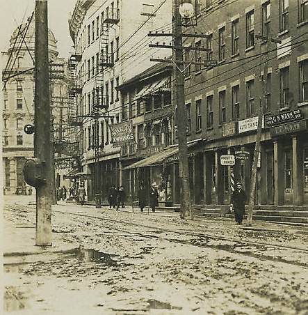 All sorts of openwire abound are seen in this New York State city neighborhood. The cast iron pole-mounted box seen on the left could have been a fire alarm call box. Or maybe it was for comms between that point for police or trolley conductor service... with a phone inside wired directly to the dispatcher and/or HQ (as was typical back when this image was taken). The circular reel seen above it was for lowering the span wire street light (upper center right) that once lit this intersection for its maintenance. |