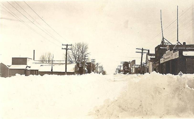 Electric customers were served by the double-crossarm line along the left with a telephone openwire lead on the right. Note the two tall poles atop one of the buildings on the right. These stancions apparently supported wire antennae for radio transmission or reception. Let's hope this storm didn't knock any of this into the phone wires aside and beneath them! |