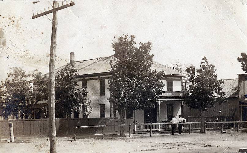 Interesting "weathered" crossarm with a little bit of bend to it with at least another arm above it in front of this older home in Texas.
