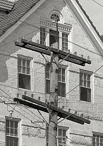 It was customary up until the teens for fire alarm telegraph circuits mounted atop utility poles. The purpose was so that these important wires would not be physically and interfered with any other wires that might happen to physically touch them, thus causing electrical connection problems between the call box and nearest fire station. When paired telephone cable and electrical utility distribution circuits became more standardized (and a bit safer) commencing in the teens, new and upgraded lines saw fire alarm curcuits mounted lower along pole routes. This photo is from an edited Shorpy image. |